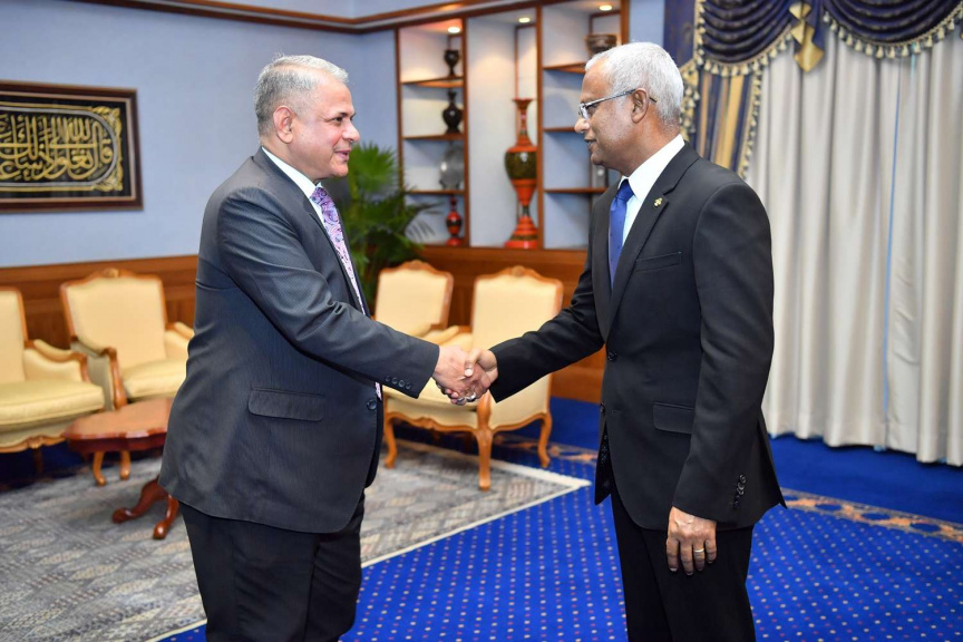 ސާކްގެ ސެކްރެޓަރީ ޖެެނެރަލް އަމްޖަދު ހުސައިން ރައީސް އިބްރާހިމް މުހައްމަދު ސޯލިހުއާ ބައްދަލު ކުރައްވަނީ -- ފޮޓޯ: ރައީސް އޮފީސް