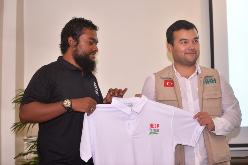 " ހެލްޕް މޯލްޑިވްސް ޔަމަން" އާ ބެހޭގޮތުން ބޭއްވި ނިއުސް ކޮންފަރެންސްގެ ތެރެއިން-- ސަން ފޮޓޯ؛ އަހުމަދު އަވްޝަން އިލްޔާސް