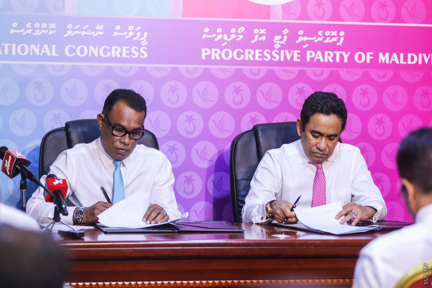 އިދިކޮޅު މައި ޕާޓީ ޕީޕީއެމްއާއި އަލަށް އުފެއްދެވި ޕީޕަލްސް ނޭޝަނަލް ކޮންގްރެސް (ޕީއެންސީ) ގުޅިގެން ސިޔާސީ މަސައްކަތް ކުރެއްވުމަށް ކޯލިޝަން އެއްބަސް ވުމެއްގައި ސޮއި ކޮށްފި އެވެ.