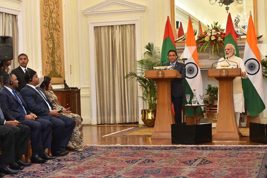 ކުރީގެ ރައީސް އަބްދުﷲ ޔާމީން އިންޑިއާއަށް ކުރެއްވި ދަތުރުފުޅުގައި އެމަނިކުފަނާއި އިންޑިއާގެ ބޮޑުވަޒީރު ނަރެންދްރާ މޯދީ ޖޮއިންޓް ސްޓޭޓްމަންޓް ދެއްވި ވަގުތު، ދުންޔާ (ވ) --- ފޮޓޯ/ ރައީސް އޮފީސް