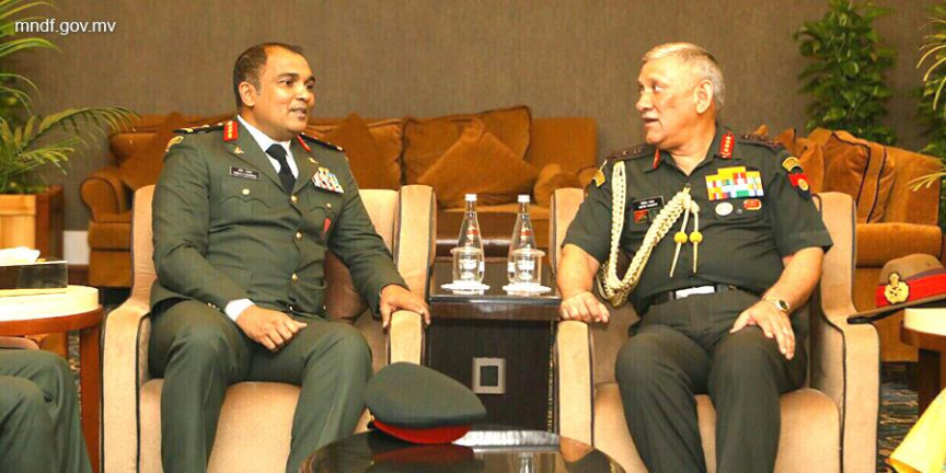 އިންޑިއާގެ ސިފައިންގެ އެންމެ އިސް ވެރިޔާ ބިޕިން ރާވަތު ޗީފް އޮފް ޑިފެންސް ފޯސް މޭޖާ ޖެނެރަލް އަބްދުﷲ ޝަމާލްއާ ބައްދަލުކުރައްވަނީ -- ފޮޓޯ/ އެމްއެންޑީއެފް