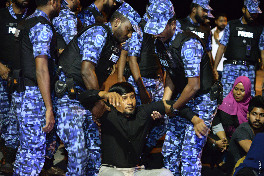 ރޭ ޕީޕީއެމް-ޕީއެންސީން މުޒާހަރާކުރި އިރު ފުލުހުން ވަނީ ވަގުތުން އެ ސަރަހައްދަށް އެއްވެ، އެއްވުން ރޫޅާލާފައެވެ. އަދި މުޒާހަރާގެ ބައިވެރިންގެ ތެރެއިން ތިން މީހަކު ފުލުހުންގެ ބެލުމުގެ ދަށަށް ގެންދިޔަތަން "ސަން"ގެ ނޫސްވެރިންނަށް ވަނީ ފެނިފައެވެ.