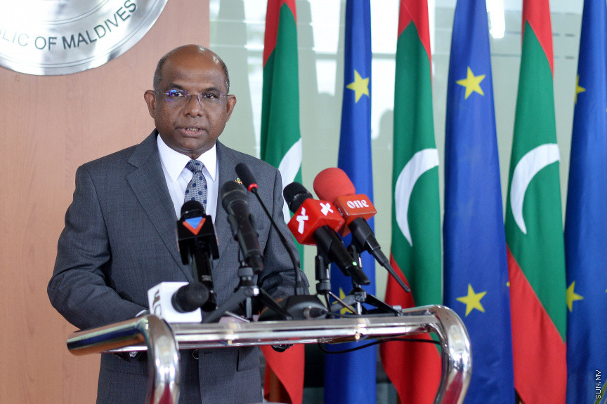 ފޮރިން މިނިސްޓަރ އަބްދުﷲ ޝާހިދު މީޑިއާއަށް މައުލޫމާތު ދެއްވުން -- ސަން ފޮޓޯ-- ފަޔާޒު މޫސާ