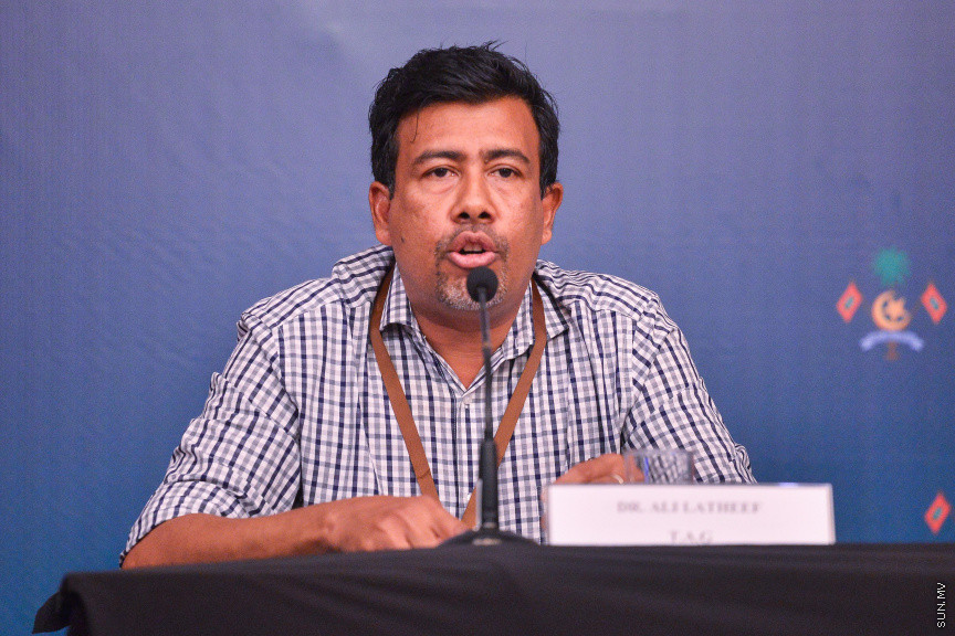 ނޫސްވެރިންގެ ބައްދަލުވުމުގައި ޑރ. އަލީ ލަތީފު ވާހަކަ ދައްކަވަނީ -- ސަން ފޮޓޯ/ ފަޔާޒު މޫސާ