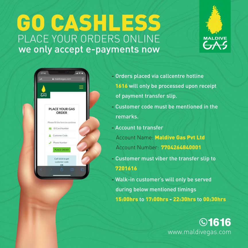 ދެ ވަނަ ގޮތަކީ މޯލްޑިވް ގޭސްގެ ހޮޓްލައިން ނަންބަރު 1616އަށް ގުޅުއިގެން އޯޑަރު ކުރުމަށް ފަހު އެކުންފުނީގެ ބީއެމްއެލް އެކައުންޓަށް (770426484001) ފައިސާ ޓްރާންސްފާ ކުރުމެވެ.