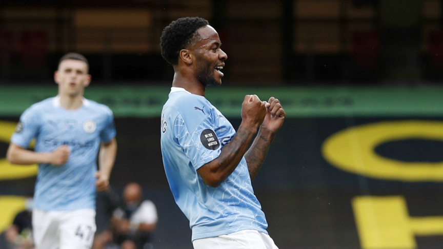ޕްރިމިއާ ލީގުގައި ރޭ ވަޓްފޯޑް ކޮޅަށް ގޯލު ޖެހުމަށްފަހު މެންޗެސްޓާ ސިޓީގެ ފޯވާޑް ރަހީމް ސްޓާލިންގް އުފާފާޅު ކުރަނީ --- ފޮޓޯ//ލައިވްސްކޯ