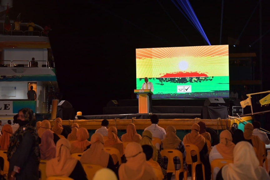 "ރާއްޖޭގެ ލޮބުވެތި ރައްޔިތުން މި ދަތުރަށް އެއްމާރަކުން ފޮށިތައް އެމްޑީޕީއާްއެކު ބަންނަވާ. އެނިންމާލަމުންވެސް ދަންނަވާނީ އެންމެގެ ވޯޓު އެމްޑީޕީއަށް. އެންމެންގެ ވޯޓު އެމްޑީޕީއަށް،" ރައީސްގެ ވާހަކަ ނިންމާލައްވަމުން ވިދާޅުވި އެވެ.