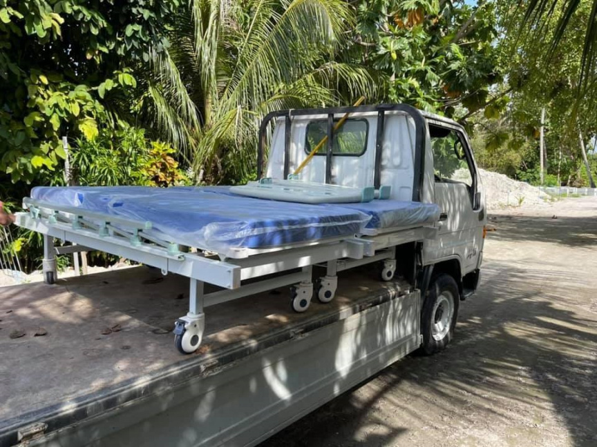 ކުޑަފަރީގައި ތިބި ތެދުވެ ނޫޅެވޭ މީހުންނަށް ފޯރުވައިދޭން ގެންދިޔަ ހޮސްޕިޓަލް އެނދުތައް ގޭގެއަށް ގެންދަނީ -- ފޮޓޯ/ ކައުންސިލް