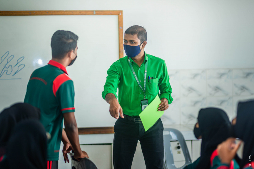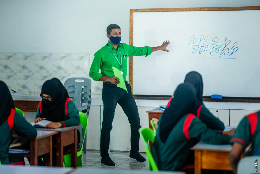 ށ. ފުނަދޫ ސްކޫލްގެ ޓީޗަރު އާދަމް ޝަރީފް ކްލާސް ރޫމުގައި ކިޔަވައިދެނީ --- ސަން ފޮޓޯ/ ޖަވާދު މުހައްމަދު