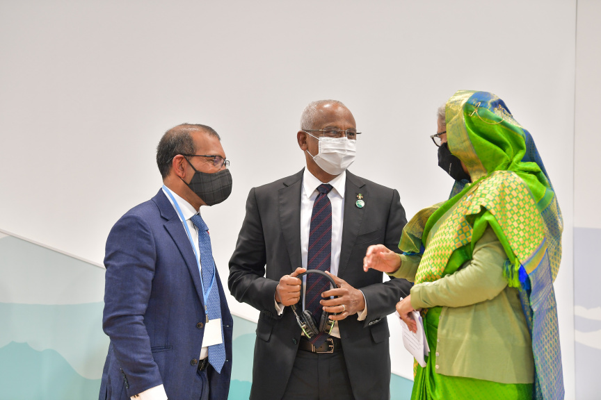 ކޮޕް26 ސަމިޓުގެ ހަވާސާގައި ބޭއްވި މަތީ ފަންތީގެ ބައްދަލުވުމުގައި ބަންްލަދޭޝްގެ ބޮޑުވަޒީރު ޝެއިހް ހަސީނާއާއި ރައީސް އިބްރާހިމް މުހައްމަދު ސޯލިހުގެ އިތުރުން މަޖިލިސް ރައީސް މުހައްމަދު ނަޝީދު -- ފޮޓޯ/ ރައީސް އޮފީސް