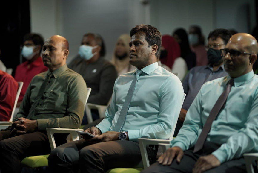 ނޮވެމްބަރު 3، 2021: ނަސްރުގެ ދުވަހާ ގުޅިގެން އުމަރު އިސްކޮށް ހުންނަވާ ދިވެހި ނޭޝަނަލް އެކްޝަން (ޑީއެންްއޭ)އިން އިންތިޒާމުކޮށްގެން ބޭއްވި ޖަލްސާގައި އުމަރު --- ސަން ފޮޓޯ/ މުހައްމަދު ހައްޔާން