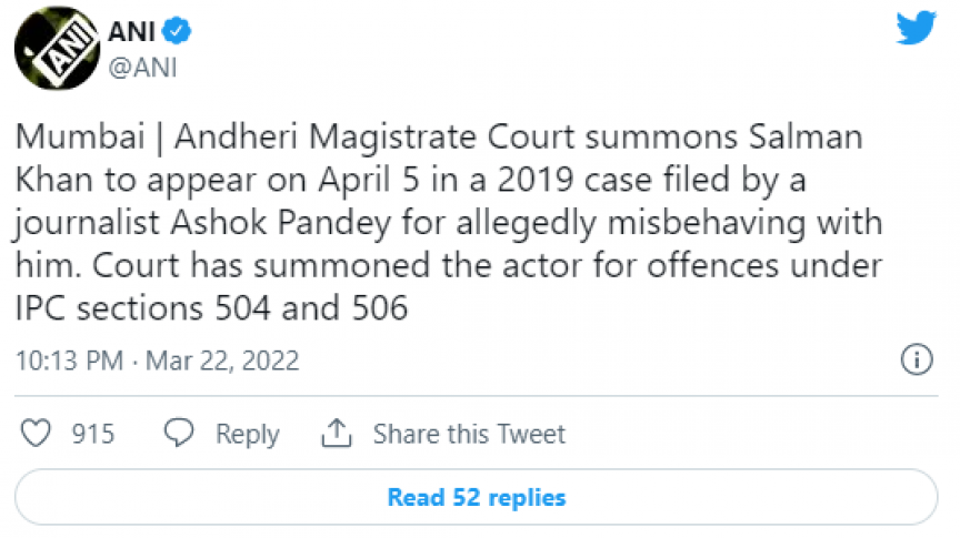 އިންޑިއާގެ އޭއެންއައި ނޫހުން ރިޕޯޓްކޮށްފައިވާ ގޮތުގައި، ނޫސްވެރިޔަކާ ބޭއަދަބީ ގޮތަކަށް މުއާމަލާތު ކުރުމުގެ ތުހުމަތުގައި ސަލްމާން އަންނަ މަހުގެ ފަހެއްގައި މެޖިސްޓްރޭޓް ކޯޓަކަށް ހާޒިރުވުމަށް ވަނީ އަންގާފައެވެ.