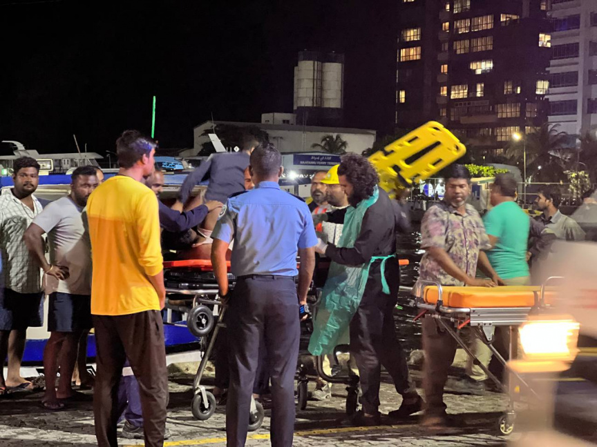 ގުޅީފަޅުގައި ހުރި އެކޮމޮޑޭޝާން ބްލޮކްގައި ރޯވި ހާދިސާގައި އަނިޔާވި މީހަކު މާލެ ގެނެސް އެމްބިއުލާންސަކަށް އަރުވަން މަސައްކަތް ކުރަނީ -- ސަން ފޮޓޯ/ ނާއިލް ހުސެއިން