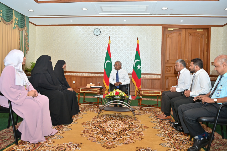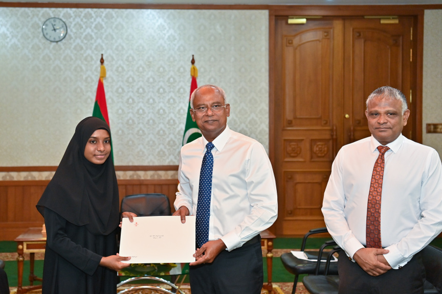 ހުޔާމްއަށް ހިތްވަރު ދެއްވީ ރައީސްގެ ސްކޮލާޝިޕް ހަމަޖެހުނުކަމުގެ ލިޔުމާއި އިނާމު އޭނާއާ ހަވާލުކުރުމަށް މިއަދު ރައީސުލްޖުމްހޫރިއްޔާގެ އޮފީހުގައި ބޭއްވެވި ބައްދަލުކުރެއްވުމުގައެވެ.