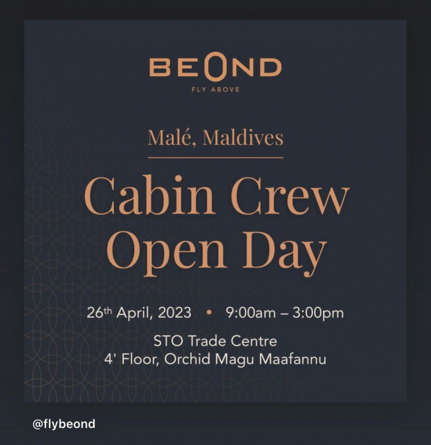 ބިއޯންޑް އެއާލައިނުން ކެބިން ކުރޫ އޯޕަންޑޭ ބޭއްވުމަށް ހަމަޖެހިފައިވަނީ މާދަމާ ހެނދުނު 09:00 – 15:00 އަށް އެސްޓީއޯ ޓްރޭޑް ސެންޓަރުގެ ހަތަރުވަނަ ފަންގިފިލާގައެވެ.