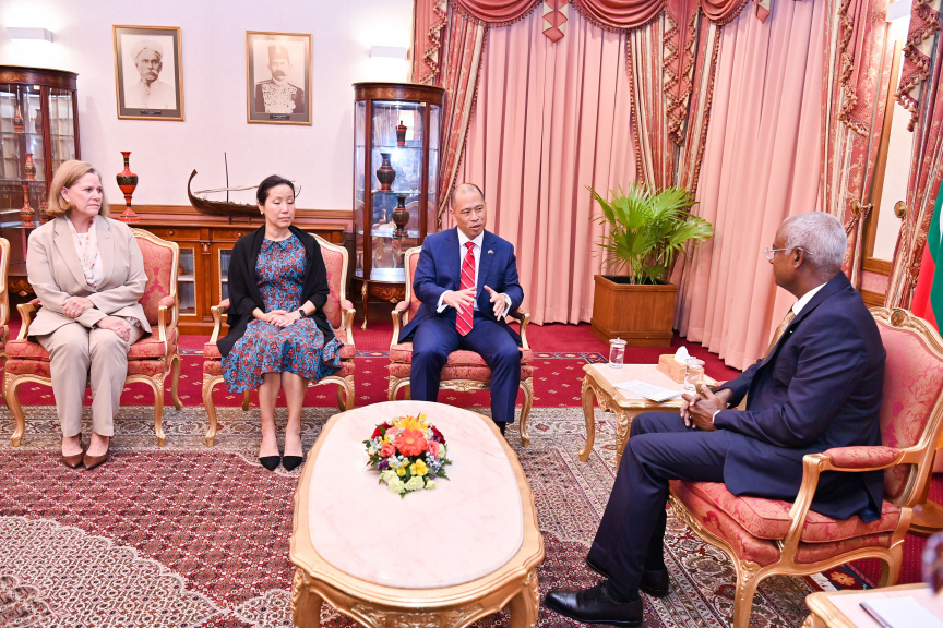 އެމެރިކާއިން ރާއްޖެއަށް ކަނޑައެޅުއްވި ފުރަތަމަ ސަފީރު ހޫގޯ ޔޫ-ހޯ ޔޮން، އެމަނިކުފާނުގެ ސަފީރުކަމުގެ ފަތްކޮޅު ރައީސުލްޖުމްހޫރިއްޔާ އިބްރާހީމް މުޙައްމަދު ޞާލިޙަށް އެރުވުމަށް ފަހު ބޭއްވި ބައްދަލުކުރެެއްވުން-- ފޮޓޯ/ ރައީސް އޮފީސް