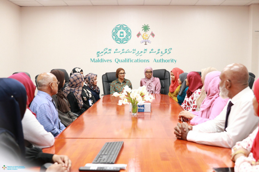 އެމްކިއުއޭގެ ސީއީއޯ އަކަށް އަލަށް އައްޔަނު ކުރެއްވި ފިޒާނާ އަދި ހަޔާ އެޑިއުކޭޝަން މިނިސްޓަރު ޑރ. މާރިޔާ، އެމްކިއުއޭގެ މުވައްޒަފުންނާ އެކު ބޭއްވި ބައްދަލުވުމުގެ ތެރެއިން-- ފޮޓޯ/ ހަޔާ އެޑިއުކޭޝަން މިނިސްޓްރީ