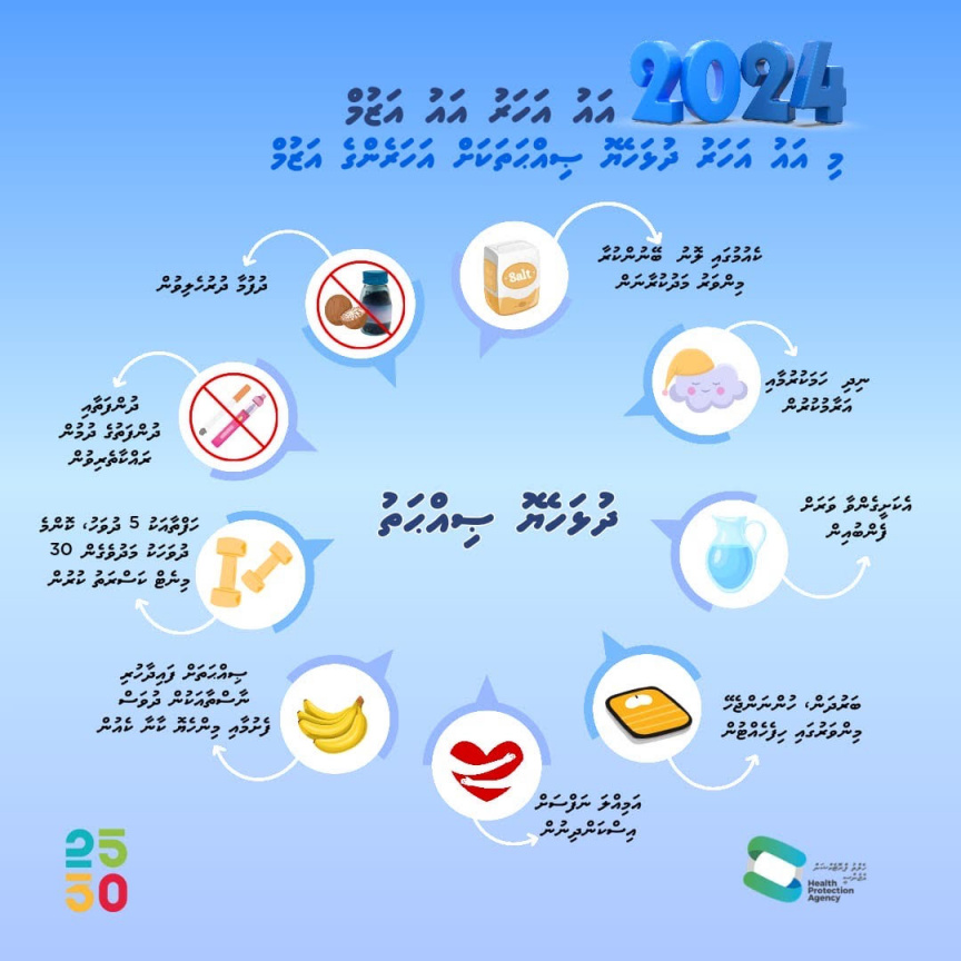 ހެލްތު ޕްރޮޓެކްޝަން އެޖެންސީ (އެޗްޕީއޭ)އިން ވަނީ މި ފެށުނު އަހަރުގެ އާ ނިއު އިޔާ ރިސޮލިއުޝަންސްގެ ގޮތުގައި ކަނޑައެޅިދާނެ ކަންތައްތަކެއް ފާހަގަކޮށްފައެވެ. އެއީ ދުޅަހެޔޮ ސިއްހަތެއް ހޯދުމަށް އާ އަހަރު އަޒުމު ކަނޑައެޅުމެވެ.
