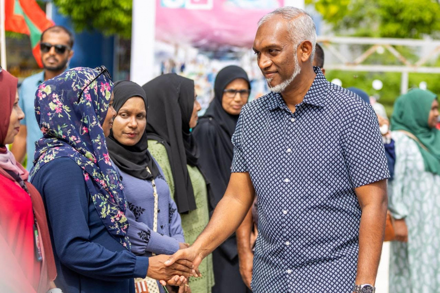 ހުޅުމާލޭގެ ފޭސް 2ގައި މިއަދު ބޭއްވި ޕީއެންސީ ކެމްޕެއިން ހަރަކާތުގެ ތެރެއިން ރައީސް މުއިއްޒު ރައްޔިތުންނާއި ސަލާމްކުރައްވަނީ --- ފޮޓޯ: މޫސާ ނަދީމް/ ސަން