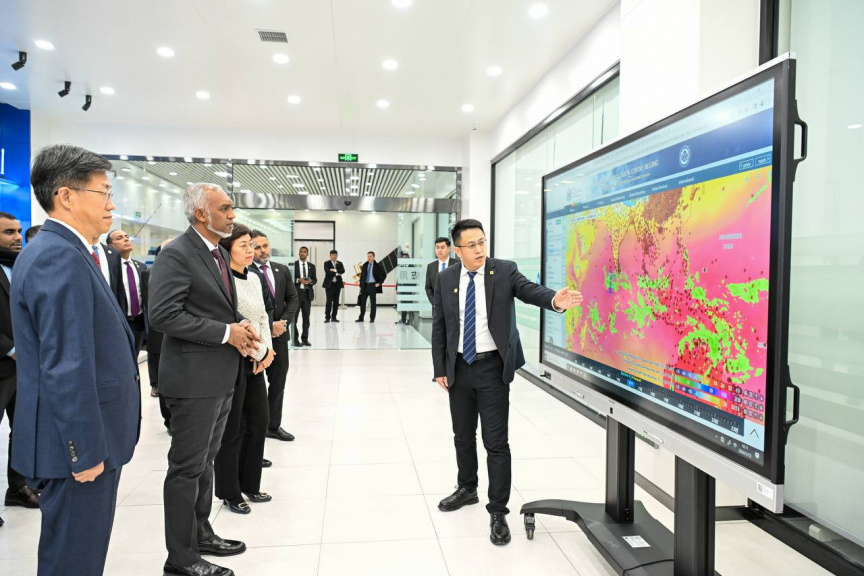 ރައީސް ޑރ. މުޙައްމަދު މުއިއްޒު ބެއިޖިންގައި ހުންނަ ނޭޝަނަލް ސެޓެލައިޓް މީޓިއޮރޮލޮޖިކަލް ސެންޓަރު (އެންއެސްއެމްސީ)އަށް ޒިޔާރާތް ކުރެއްވުމުގެ ތެރެއިން؛ އެމަނިކުފާނު ވަނީ އެތަނުގެ މަސައްކަތްތައް ބައްލަވާލައްވާފައި-- ފޮޓޯ/ ރައީސް އޮފީސް
