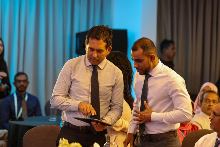 ޓޫރިޒަމް ދާއިރާއަށް އަންހެނުން ނެރުމުގެ ޕްރޮގްރާމް އިކޮނޮމިކް މިނިސްޓަރު މުޙައްމަދު ސައީދު އިފްތިތާހު ކޮށްދެއްވާއިރު އަރިހުގައި ޓޫރިޒަމް މިނިސްޓަރު ފައިސަލް-- ފޮޓޯ: ޓޫރިޒަމް މިނިސްޓްރީ
