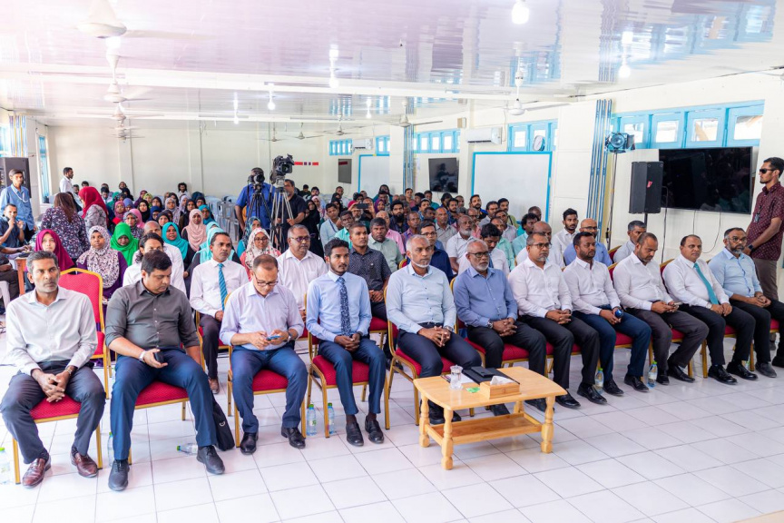 ރައީސް މުއިއްޒު، ކ. ގުރައިދޫގެ ރައްޔިތުންނާ ބައްދަލުކުރައްވަން ބޭއްވި ޖަލްސާގެ ތެރެއިން: އެ ޖަލްސާގައި އަބްދުއްރަހީމް ދެއްކެވީ ދެވަނަ ދައުރެއްގެ ވާހަކަ -- ސަން ފޮޓޯ/ މޫސާ ނަދީމް