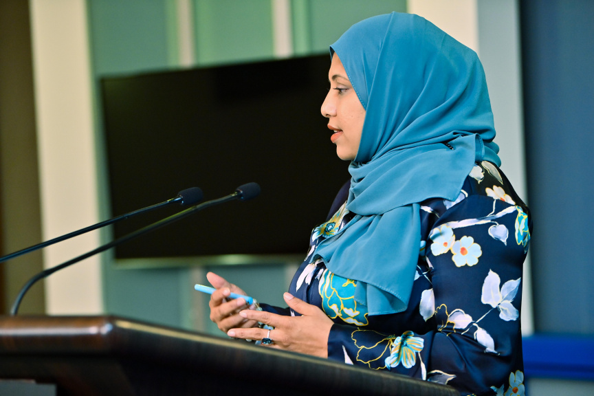 މިއަދު ރައީސް އޮފީހުގައި ބޭއްވި ނޫސްވެރިންގެ ބައްދަލުވުމުގެ ތެރެއިން: ރައީސް އޮފީހުގެ ތަރުޖަމާނު ހީނާ ވަލީދު ވިދާޅުވީ ފަލަސްތީނު މައްސަލާގައި އެންމެ ބޮޑަށް މަސައްކަތް ކުރަނީ ރާއްޖެ ކަމަށް -- ފޮޓޯ/ ރައީސް އޮފީސް
