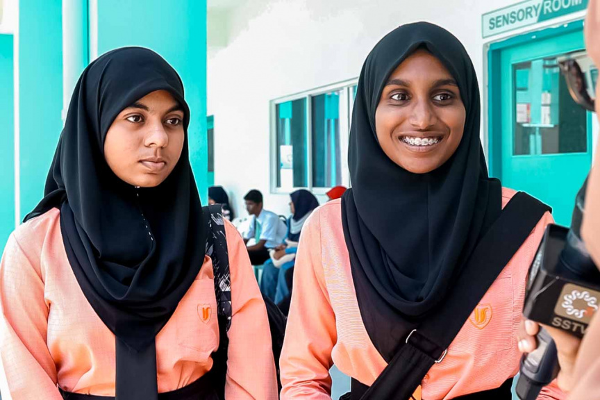 މަޒުމޫނު ލިޔުމުގެ މުބާރާތުގައި ބައިވެރިވި ދަރިވަރު 'ސަން'އަށް އިންޓަވިއު ދެނީ: ދިވެހި ބަހުގެ އެކެޑަމީގެ ގައުމީ ތިން މުބާރާތް ފަށައިފި ---- ސަން ފޮޓޯ/ ނާއިޝް ނާހިދު