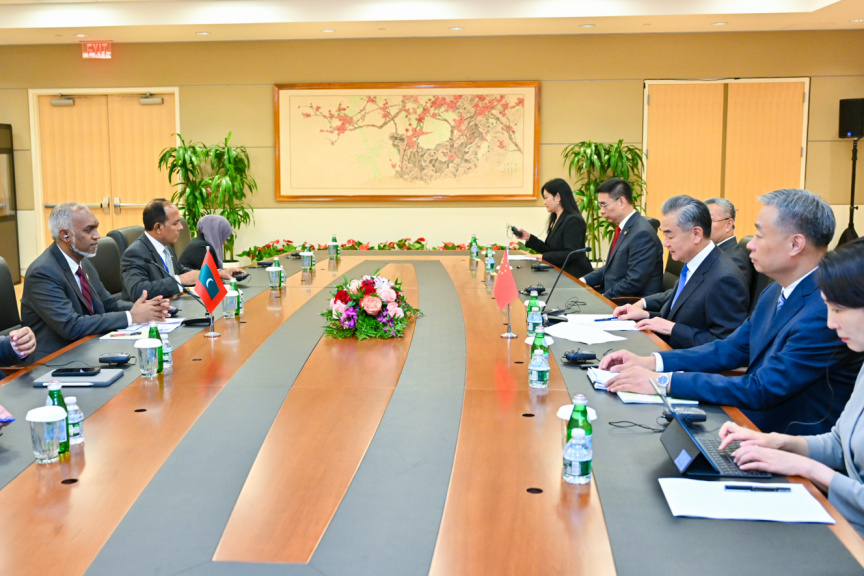 ޗައިނާގެ ފޮރިން މިނިސްޓަރު މި ޔަގީންކަން ދެއްވީ އދ.ގެ 79ވަނަ އާންމު މަޖިލީހުގައި ބައިވެރިވެ ވަޑައިގަތުމަށް ރައީސް ޑރ. މުޙައްމަދު މުޢިއްޒު ކުރައްވަމުން ގެންދަވާ ދަތުރުފުޅުގެ ތެރެއިން އެ މަނިކުފާނާ އެކު ބޭއްވެވި ބައްދަލު ކުރެއްވުމެއްގައި މަޝްވަރާ ކުރައްވަމުންނެވެ.