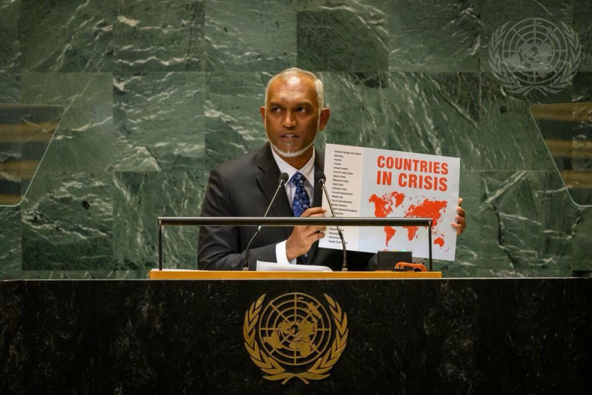 އދ. ގެ 79 ވަނަ އާންމު މަޖިލީހުގައި ތަގުރީރުކުރައްވަމުން ރައީސް މުއިއްޒު ވިދާޅުވީ، އިންސާނިއްޔަތު އޮތީ ވަރަށް ދެރަ ހާލުގައި ބޮޑު ކާރިސާއެއްގެ ތެރޭގައި ކަމަށެވެ. ބަނޑުހައިހޫނުކަމާއި ހަނގުރާމަތަކާއި ދިރިއުޅުމުގެ ޚަރަދު އިންތިހާއަށް ބޮޑުވުން ފަދަ އެތައް ކަމެއްގެ ސަބަބުން މީހުން ވަރަށް ދެރަ، ދަތި ހާލުގައި އުޅެމުން އަންނަކަން އެ މަނިކުފާނު ފާހަގަކުރެއްވިއެވެ.
