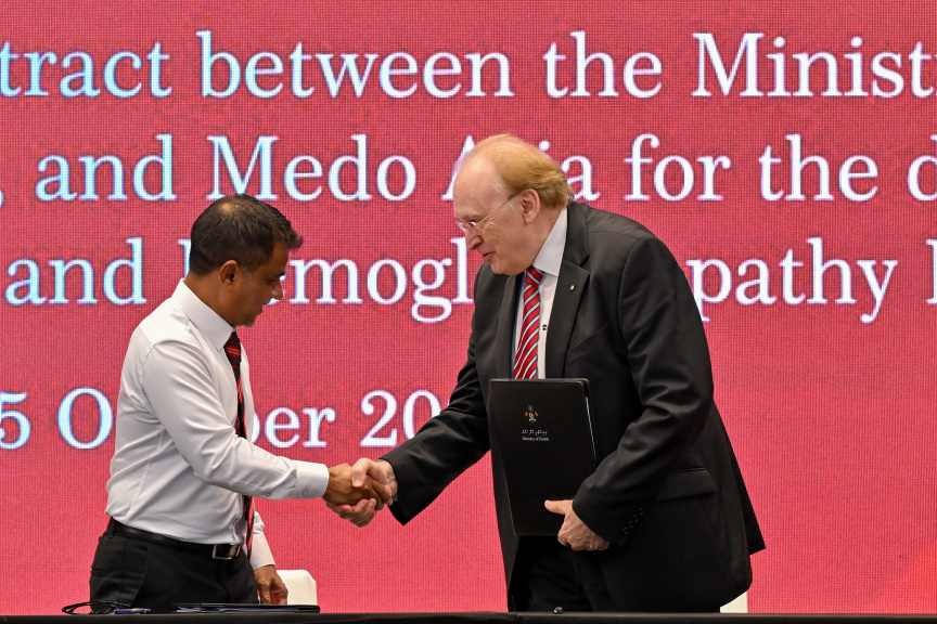 ތެލެސީމިއާ ހޮސްޕިޓަލް އަޅަން ހަވާލުކުރުން: ތެލަސީމިއާގެ ފަރުވާއަށް ޚާއްސަ ހޮސްޕިޓަލްގެ މަޝްރޫއު ހިންގާނީ މެލޭޝިއާގެ ކުންފުނިތަކަކުން -- ފޮޓޯ/ ރައީސް އޮފީސް