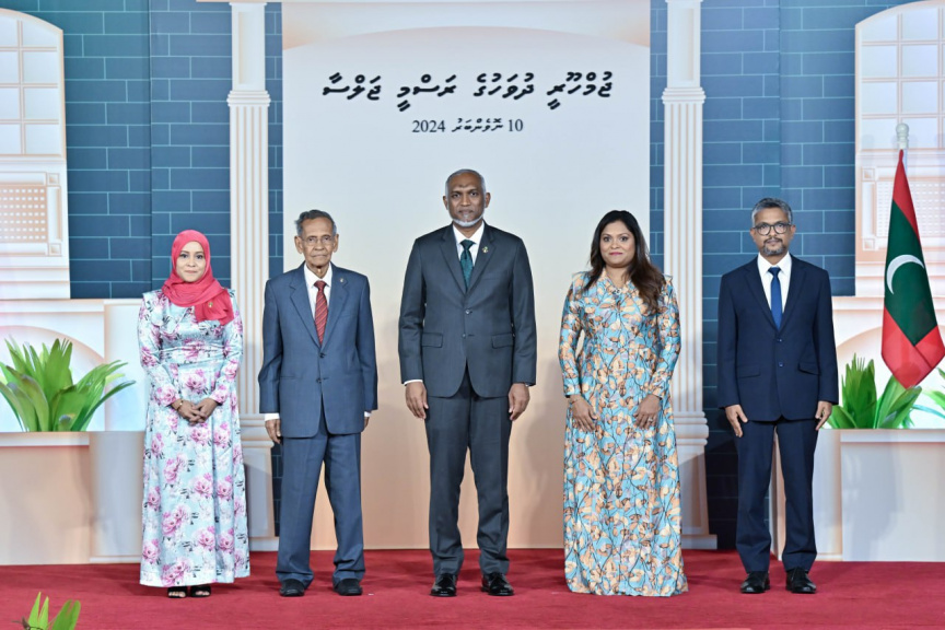 ޑރ. މުޙައްމަދު ޒާހިރު ހުސައިނާއި، ތިން ބޭފުޅުންނާއެކު ރައީސް މުއިއްޒު ފޮޓޯއަކަށް ހުއްޓިވަޑައިގެން -- ފޮޓޯ: ރައީސް އޮފީސް