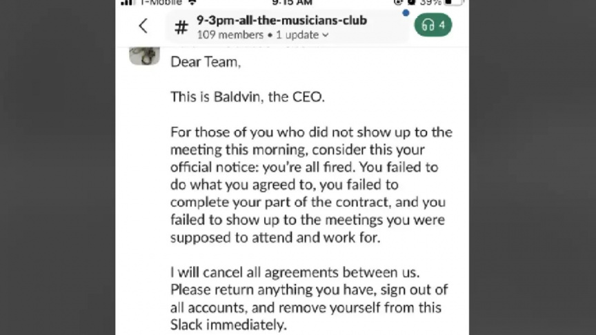 "މިއަދު ހެނދުނު ތާވަލުކުރި ބައްދަލުވުމަށް ހާޒިރުނުވި ހުރިހާ މީހުންނަށް މިއީ އެ މީހުން ވަޒީފާއިން ވަކިކުރިކަމުގެ ރަސްމީ ނޯޓިސް ކަމުގައި ބުނަން. ތިޔަ ހުރިހާ އެންމެން ވެސް ވަޒީފާއިން ވަކިކޮށްފިން،" މިއުޒިކަލް އިންސްޓްރޫމެންޓް މާކެޓް ޕްލޭސްގެ ސީއީއޯ ބޯލްޑްވިން މުވައްޒަފުންނަށް ފޮނުވި މެސެޖުގައި ބުނެފައިވެއެވެ.