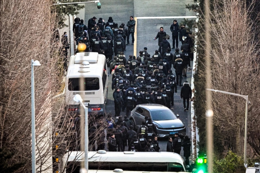 ސޯލްގައި ހުންނަ ދެކުނު ކޮރެއާގެ ރައީސް ޔޫން ސުކް ޔޮލްގެ ގެކޮޅު ކައިރީގައި ފުލުހުންގެ އޮފިސަރުން ހަރަކާތްތެރިވަނީ. ފޮޓޯ/ގެޓީ