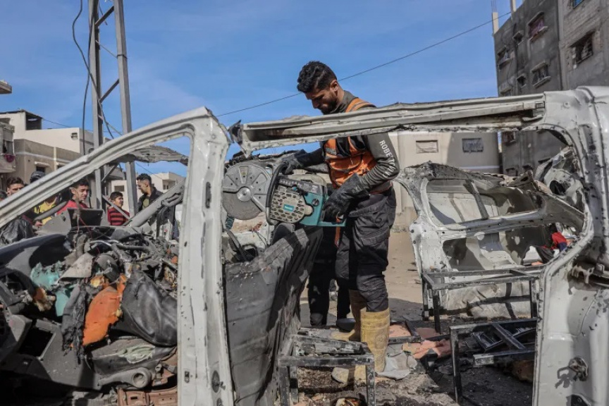 އަހުމަދު އަލްޤިދްރާގެ އާއިލާ ދަތުރުކުރި ޙިމާރު ގާޑިޔާގެ ކުރިމަތީގައި ދަތުރުކުރަމުންދިޔަ ކާރަށް ހަމަލާ އަމާޒުވެފައި. ފޮޓޯ/އަލް ޖަޒީރާ