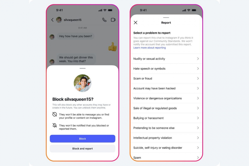 ޑީއެމް (ޑައިރެކްޓް މެސެޖް)ގެ ތެރެއިން މީހަކު ބްލޮކްކުރަން އުޅުމުން، "ބްލޮކް އެންޑް ރިޕޯޓް" (ބްލޮކްކޮށް ރިޕޯޓްކުރުން)ގެ ނަމުގައި އިތުރު އޮޕްޝަނެއް ފެންނާނެ ގޮތް ވެސް ވަނީ ހަދާފައެވެ. މެޓާއިން ބުނީ، މީގެ ސަބަބުން ނޭދެވޭ މުއާމަލާތެއް ހުއްޓުވާލުމާ އެކު، އެކަން މެޓާއަށް ވަރަށް ފަސޭހައިން އެންމެ ކްލިކަކުން ރިޕޯޓް ކުރެވޭނެ ކަމަށެވެ.
