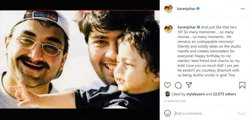 ކަރަން ފިލްމު "ސައްޔާރާ"ގެ ޕްރޮޑިއުސަރު އަދިތިޔަ ޗޯޕްރާގެ އުފަންދުވަހާ ގުޅިގެން އާއްމުކުރި ފޮޓޯއެއް--ފޮޓޯ/އިންސްޓަގްރާމް