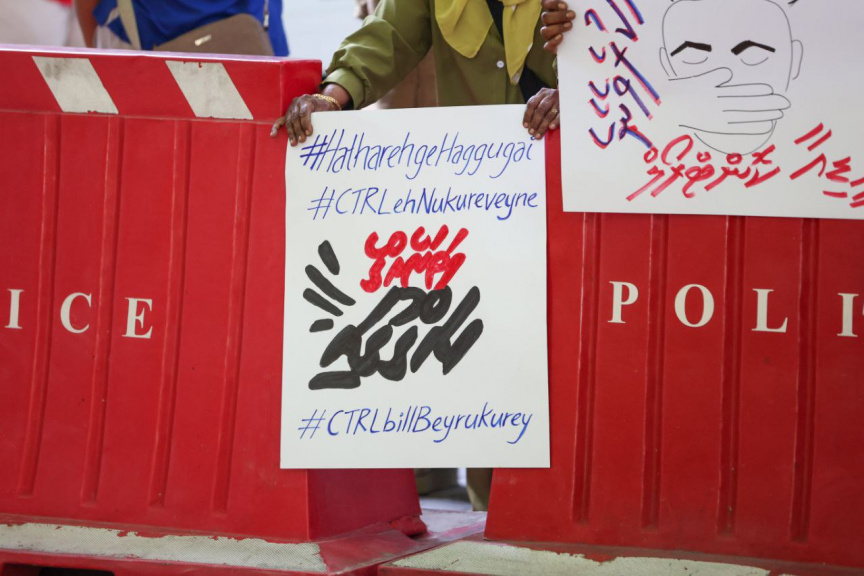 މަޖިލިސް ދޮށުގައި އިހުތިޖާޖު ކުރަނީ: ނޫސްވެރިން ގޮވާލީ މީޑިއާގެ ކޮންޓްރޯލް ރައީސަށް ނުދިނުމަށް-- ފޮޓޯ/ އަލީ ނިޝާން (މިލްޒީރޯ)