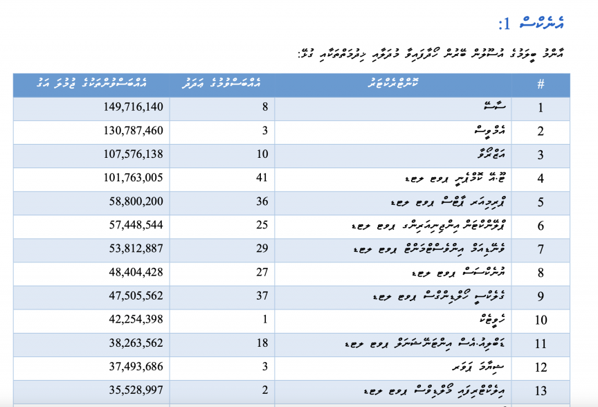 އޮޑިޓް ރިޕޯޓް ބުނާގޮތުން އާއްމު ބީލަމުގެ ބޭރުން ދީފައިވާ މަސައްކަތްތަކަށް ބަލާއިރު އެންމެ ބޮޑު އެއްޗެއް ދީފައިވަނީ "ސާސޭ" ކިޔާ ކުންފުންޏަކަށެވެ. އެ ކުންފުންޏާ ހަވާލުކުރި އަށް މަސައްކަތެއްގެ އަގު 149 މިލިއަން ރުފިޔާއަށް އަރައެވެ. ދެވަނައަށް އެންމެ ބޮޑު އެއްޗެއް ދީފައިވަނީ އެމްވީސް ކިޔާ ކުންފުންޏަކަށެވެ. އެ ކުންފުންޏަށް ދީފައިވާ މަސައްކަތްތަކުގެ އަގު 130 މިލިއަނަށް އަރައެވެ. ތިންވަނައަށް އެންމެ ބޮޑު އެއްޗެއް ދީފައިވަނީ އަޒްރާވޯ ކިޔާ ކުންފުންޏަކަށެވެ. އެއީ 107 މިލިއަން ރުފިޔާގެ މަސައްކަތެވެ. ހަތަރުވަނައަށް އެންމެ ބޮޑު އެއްޗެއް ދީފައިވަނީ ޓޫއޭ ކޮމްޕެނީއަށެވެ. އެއީ 101 މިލިއަން ރުފިޔާގެ މަސައްކަތެވެ. މިހެން ގޮސް 62 ކުންފުންޏަކަށް އެތައް ޕްރޮޖެކްޓެއް ވަނީ ދީފައެވެ.