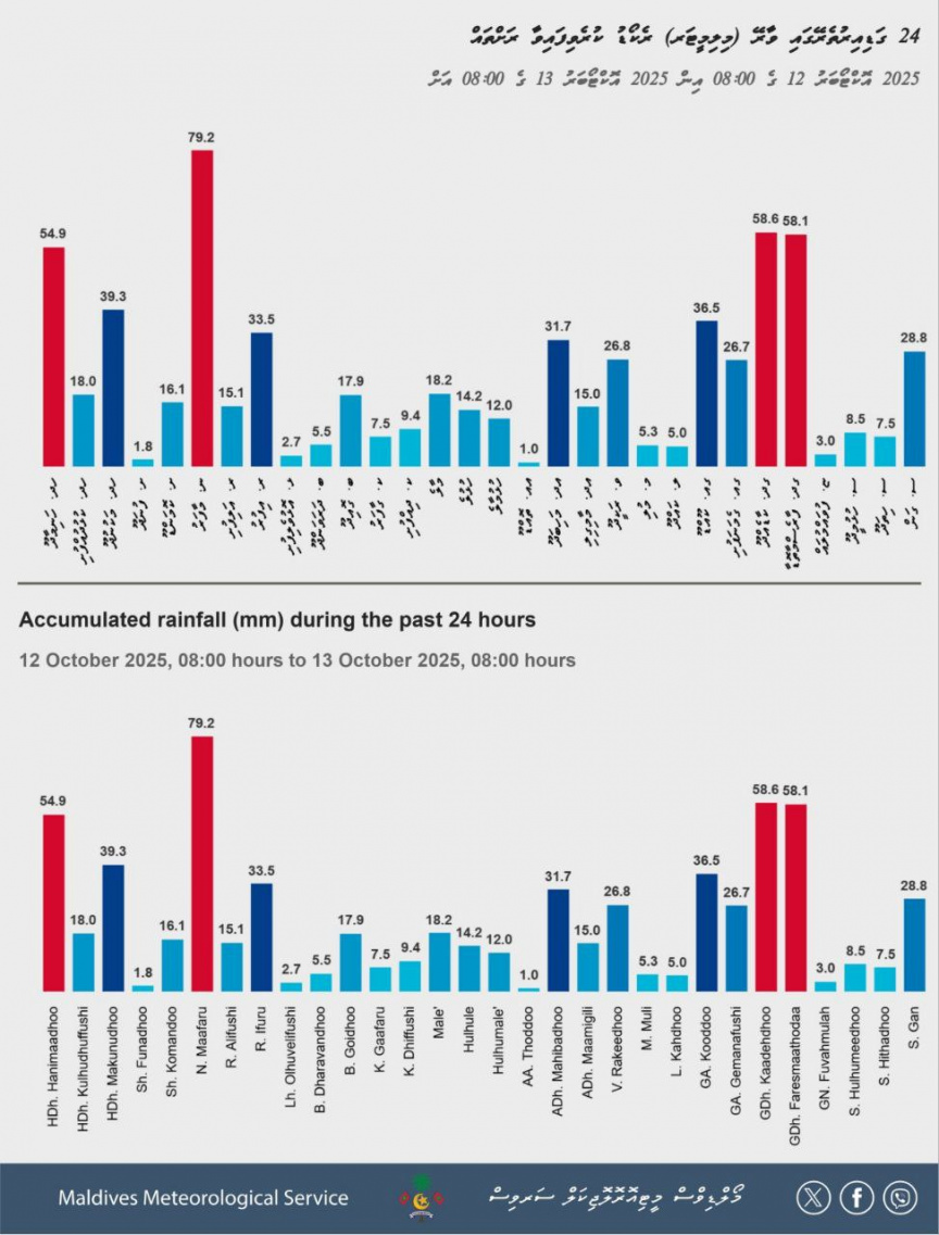 އިއްޔެ ހެނދުނު 8:00 އިން މިއަދު ހެނދުނު 8:00 އާ ހަމައަށް މާފަރަށް 79.2 މިލިމީޓަރުގެ ބޯކޮށް ވާރޭވެހިފައިވާ ކަމަށް މެޓް އޮފީހުން ބުނެއެވެ.