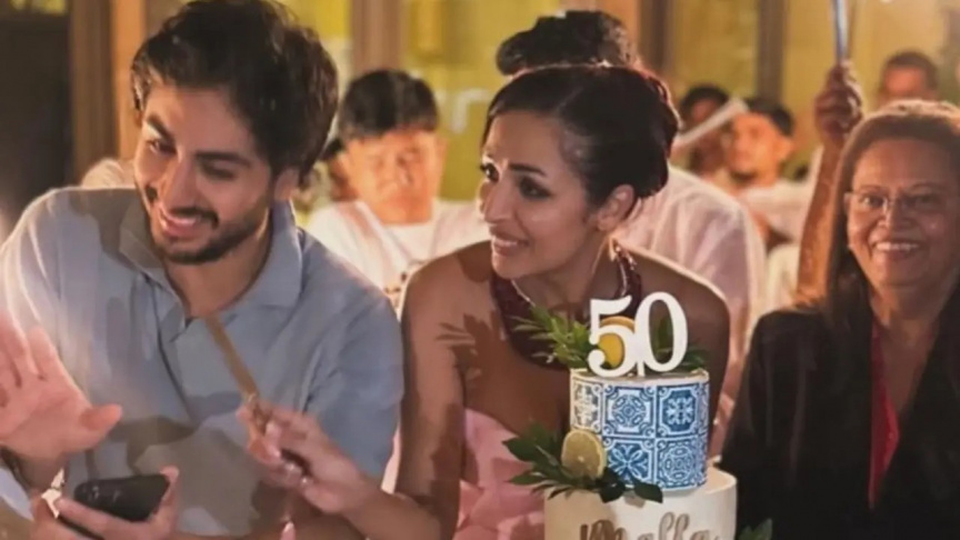 މަލައިކާ އުފަންދުވަހާ ގުޅުވައިގެން ބޭއްވި ހަފްލާގައި ދަރިފުޅު އަރްހާން ޚާން އަދި މަންމަ ޖޮއިސްއާ އެކު--ފޮޓޯ/މިޑްޑޭ