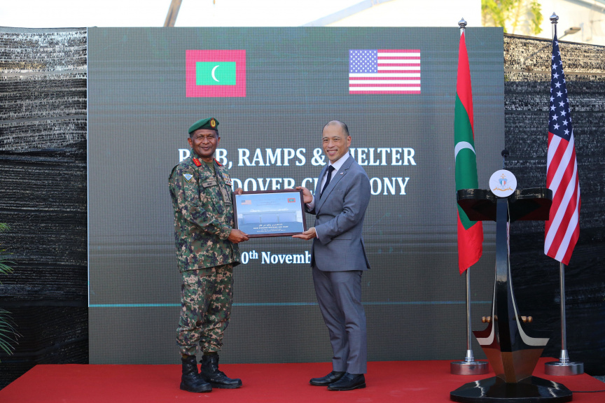 އެމެރިކާއިން ރާއްޖެއަށް ބައެއް އަސްކަރީ ސާމާނުތައް ހަދިޔާކުރުމަށް ބޭއްވި ރަސްމިއްޔާތުގެ ތެެރެއިން---ފޮޓޯ: އެމްއެންޑީއެފް