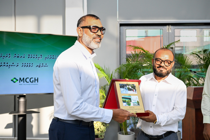 ވެމްކޯގެ އެމްޑީ މުޖުތަބާ ޖަލީލް، އާބަން ޕްރައިމަރީ ހެލްތުކެއާ ސެންޓަރުގެ އިމާރާތް އެމްސީޖީއެޗްގެ ސީއީއޯ އިބްރާހީމް އަބްދުއްރައްޒާޤް ހަލީމާ ހަވާލުކުރައްވަނީ --- ފޮޓޯ: ރައީސް އޮފީސް