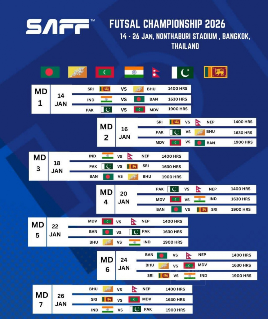 ސާފް ފުޓްސަލް ޗެމްޕިއަންޝިޕް 2026 ގައި ދިވެހިރާއްޖޭގެ ގައުމީ ފިރިހެން ފުޓްސަލް ޓީމުގެ ކުޅެން ޖެހޭ ފުރަތަމަ މެޗުގައި ޕާކިސްތާނާއި ދެކޮޅަށް، އަދި ގައުމީ އަންހެން ފުޓްސަލް ޓީމު ކުޅޭ ފުރަތަމަ މެޗުގައި އިންޑިއާ ބައްދަލުކުރަން ޖެހިއްޖެއެވެ.