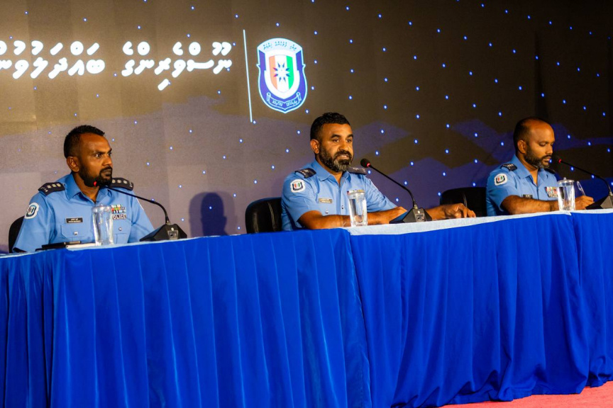 އޮޕަރޭޝަނާ ގުޅޭގޮތުން ނޫސްވެރިންނަށް މައުލޫމާތު ދިނުމަށް ފުލުހުން ބޭއްވި ބައްދަލުވުމުގައި ޑްރަގް އެންފޯސްމަންޓް ޑިޕާޓްމަންޓުގެ ވެރިން -- ސަން ފޮޓޯ: މޫސާ ނަދީމް