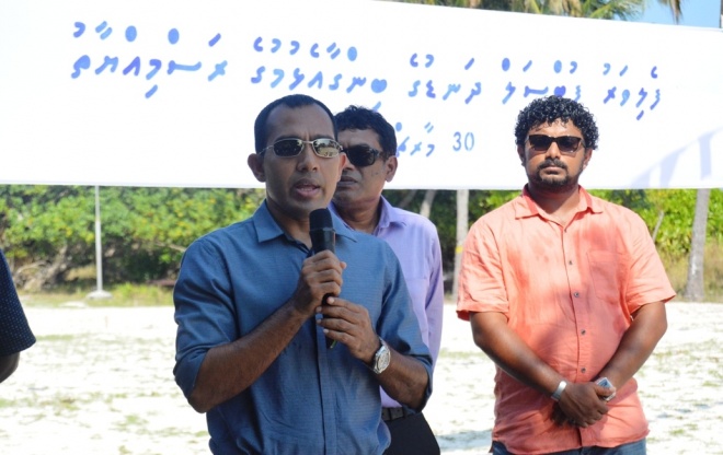 ފެލިވަރުގައި ގާއިމްކުރާ ފުޓްސެލް ދަނޑުގެ ބިންގާ އެޅުމުގެ ރަސްމިއްޔާތުގައި މިނިސްޓަރު ވާހަކަ ދައްކަވަނީ --- ސަން ފޮޓޯ/ އަހުމަދު ޖުނައިދު