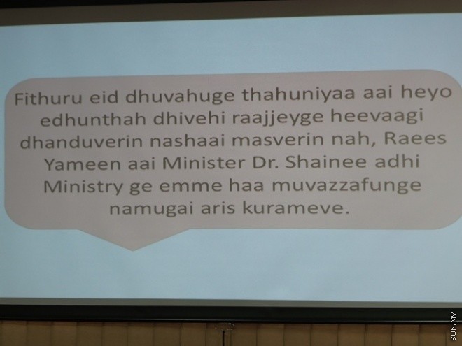 މަސްވެރިންނާއި ދަނޑުވެރިންނަށް އެސްއެމްއެސް ފޮނުވާ ނިޒާމް އިފްތިތާހުކުރުމަށްފަހު މިނިސްޓަރު ޑރ. ޝައިނީ މީޑިއާ އަށް މައުލޫމާތު ދެއްވަނީ -- ސަން ފޮޓޯ: މުހައްމަދު ނާސިހު