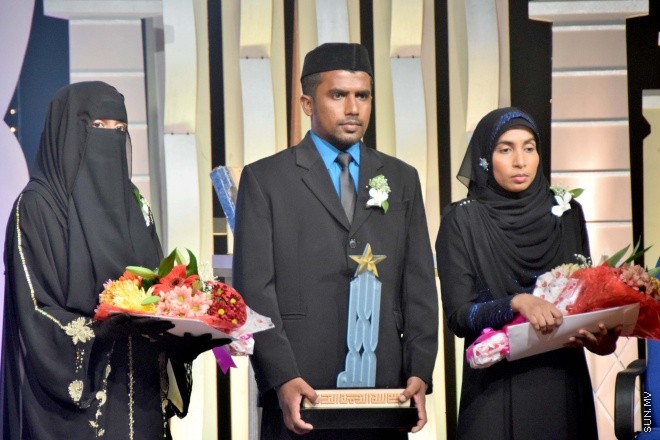 މިއަހަރުގެ އެންމެ އަލިގަދަ ތަރިއަކަށް ހޮވުނު އިބްރާހީމް އަލީ އަށް އިސްލާމިކް މިނިސްޓަރު ޑރ. އަހްމަދު ޒިޔާދު ބާގިރު ޓްރޮފީ ހަވާލުކޮށްދެއްވަނީ ---- ސަން ފޮޓޯ: އަލީ ނަސީރު