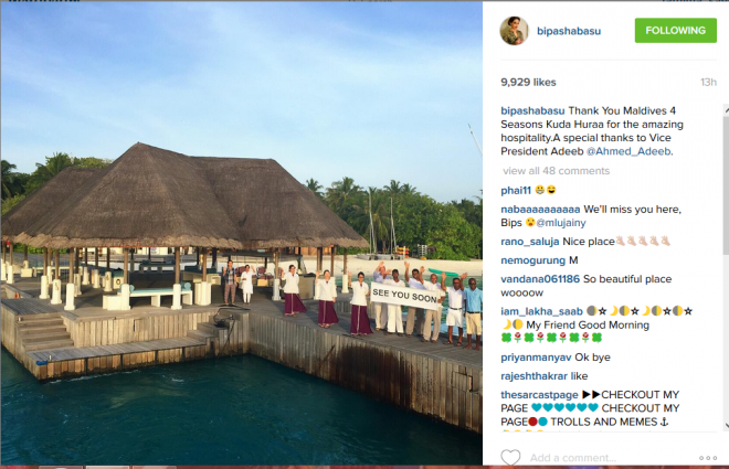 ބިޕާޝާގެ އިންސްޓާ ގްރާމްގައި ކޮށްފައިވާ ޕޯސްޓެއްގައި ބުނެފައި ވަނީ ދެއްވި މެހެމާންދާރީ އަށް ޓަކައި ފޯސީޒަން ކުޑަހުރާ މޯލްޑިވްސްއަށް ޝުކުރު އަދާކުރާ ކަމަށާއި އަދި ވަރަށް ހާއްސަ ޝުކުރެއް ނައިބު ރައީސް އަހުމަދު އަދީބަށް އަދާކުރާ ކަމަށެވެ.