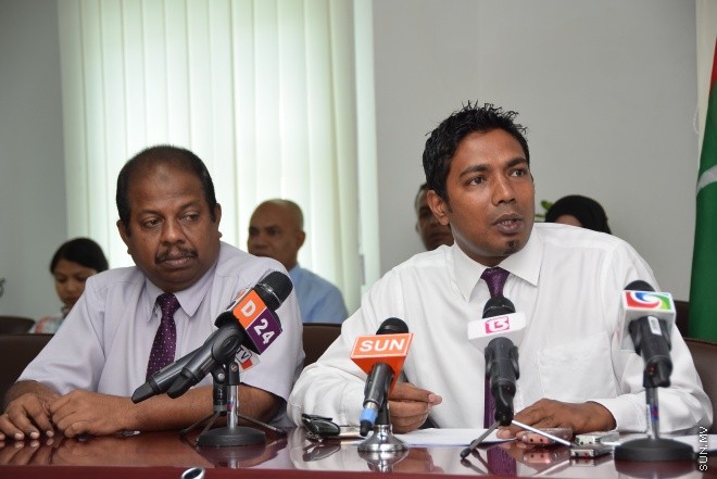 ސިއްހީ މަރުކަޒުތަކުގެ މަސައްކަތް ހަވާލުކުރުމަށް ބޭއްވި ރަސްމިއްޔާތުގައި ހެލްްތު މިނިސްޓަރު އިރުތިޝާމް އާދަމް -- ސަން ފޮޓޯ: ފަޔާޒް މޫސާ